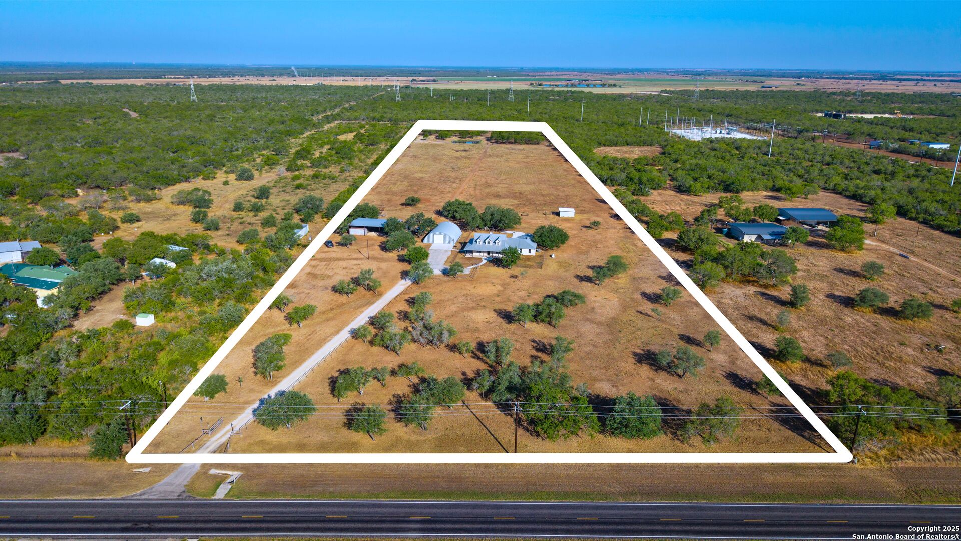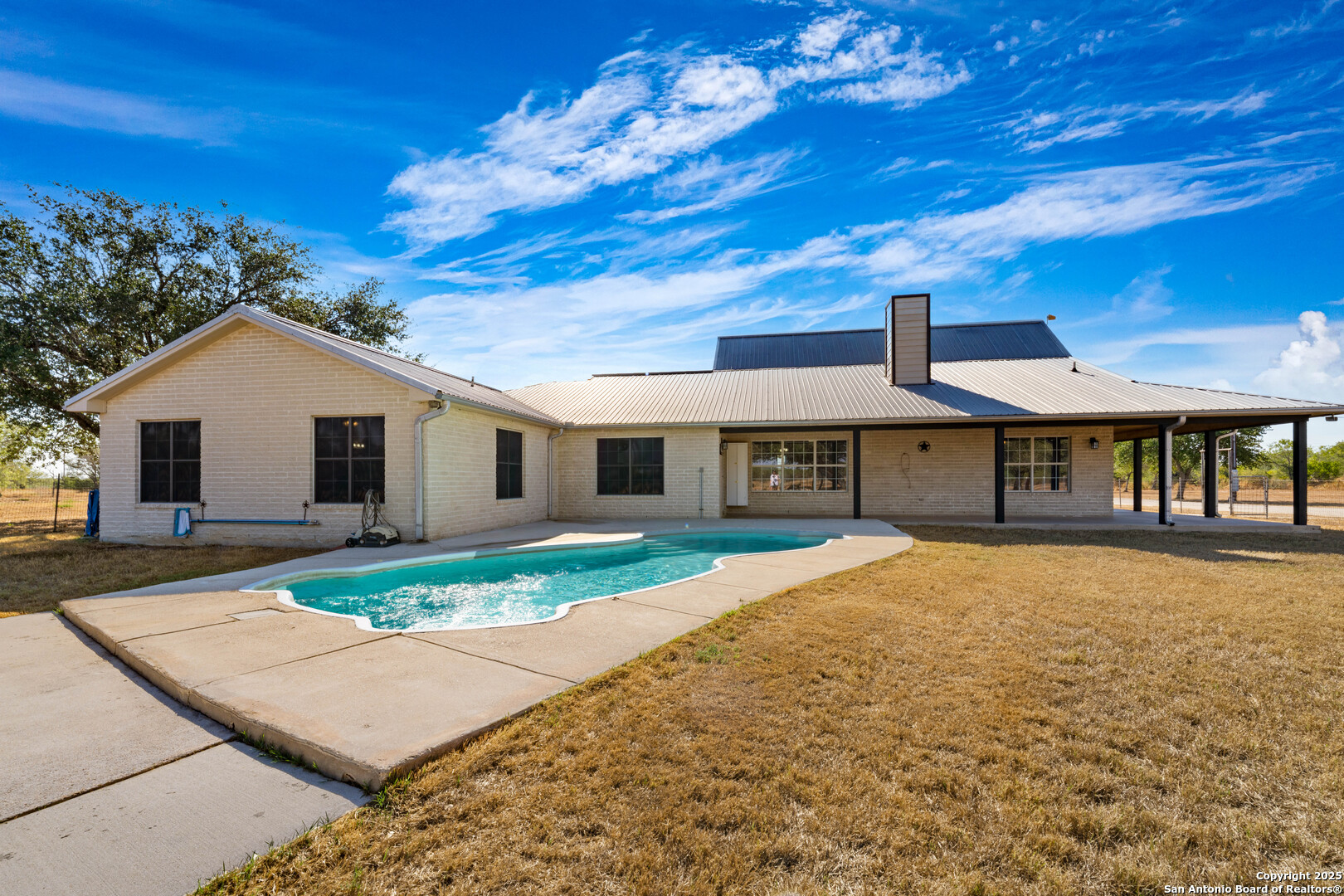Discover the charm of country living in this beautifully maintained home, perfectly situated on 20 serene acres less than 50 miles from San Antonio and just 17 miles from Pleasanton. This inviting property offers the best of both worlds - peaceful seclusion with convenient access to city amenities. Inside, you'll find 3 spacious bedrooms, 2.5 baths, and an open floor plan designed for comfort and entertaining. The large living room flows into a formal dining area and a bright kitchen featuring a center island and a second eating space. A versatile bonus room can easily serve as a fourth bedroom, home office, or game room. The oversized laundry room adds functionality and convenience. The primary suite provides a relaxing retreat with its corner garden tub, separate shower, and double vanity. Step outside to your private oasis - a sparkling inground pool surrounded by generous patio space, a brick firepit, and a charming wrap-around porch ideal for morning coffee or evening gatherings. A large detached metal quonset hut with concrete floor includes a finished living space/apartment. There are full rv hookups, and a started shop with frame and concrete. The land is perfectly set up for livestock, with a small set of cattle pens, a wide-open grazing field, native brush, and a picturesque pond that attracts local wildlife. This property has it all - space, versatility, and that true Texas country feel. Come see it for yourself and experience the peace and beauty of rural living!