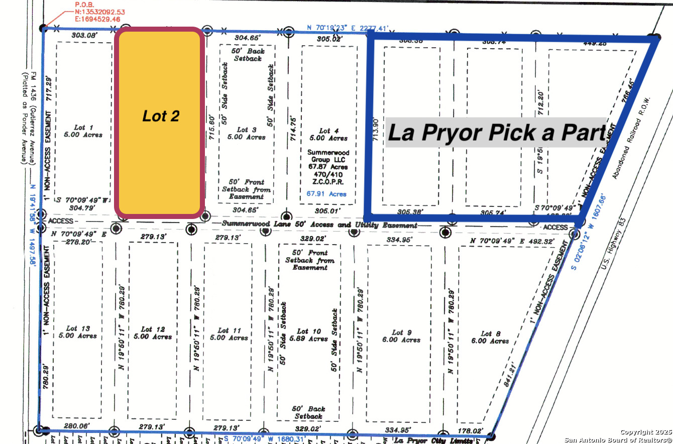 New "Summerwood Subdivision" in La Pryor, Tx offering unrestricted lots from 1-6 acres. This Lot 2 has 304' frontage on Summerwood Lane. Water and electricity will be available at the street. This land may also be a great home sight or for agriculture or commercial use. Property tax information is not yet available as taxes have not been assessed yet.