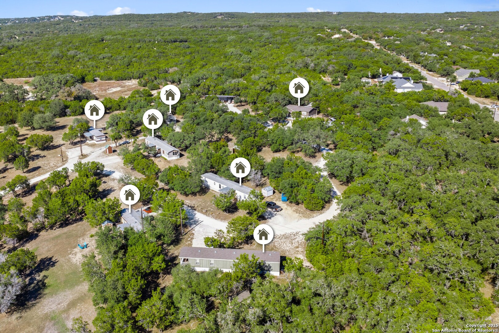 Positioned in one of the fastest-growing lake communities in the Hill Country, this unique property offers an exceptional investment opportunity with immediate income and significant long-term upside. Spanning 20.58 unrestricted acres, this versatile property delivers a rare combination of natural beauty, development flexibility, and strong cash-flow potential. Potters Creek lines the entire southern border, creating a private and scenic natural boundary, while a well-fed pond welcomes you at the entrance. The included half-acre lot in Rocky Creek Ranch directly adjoins the main acreage and provides a valuable 2" water line from Texas Water Company-an infrastructure advantage that enhances future expansion or redevelopment options. With the ability to subdivide into smaller tracts or extend the existing improvements, the land itself is the foundation for endless investment possibilities. Currently operated as a mobile home park with long and short-term rentals, you'll have the rare advantage of turnkey cash flow from day one. The thoughtfully maintained improvements include (1) double-wide residence, (6) single-wide homes, a 240 sqft rental cabin, and an additional 240 sqft unit ready for completion-all in excellent condition and generating consistent rental demand. A 2060 equipment storage building, 1220 building, and 1020 carport with storage add operational convenience, while (9) 200-amp meter loops support continued growth. Fencing on three sides, well-maintained grounds, and lake views from the top of the two-story home all add to the property's appeal. Location is another key value driver. Situated in the city of Canyon Lake-one of Texas' most desirable recreational markets-this area attracts steady tourism, year-round renters, and long-term residents seeking proximity to the lake and other Hill Country amenities. The strong short-term rental demand, combined with easy access to San Antonio, New Braunfels, and major regional corridors, makes this the ideal market for investor-focused properties. The options are wide open: continue operating the established rental model, expand with additional units, or pursue a complete redevelopment that maximizes the acreage's prime location. Don't miss this exceptional opportunity! *Rental units are currently occupied; please do not disturb tenants*
