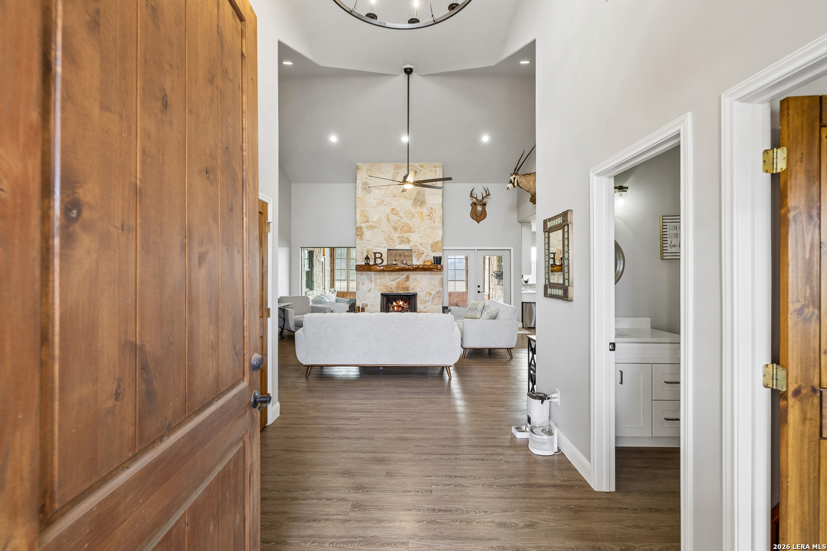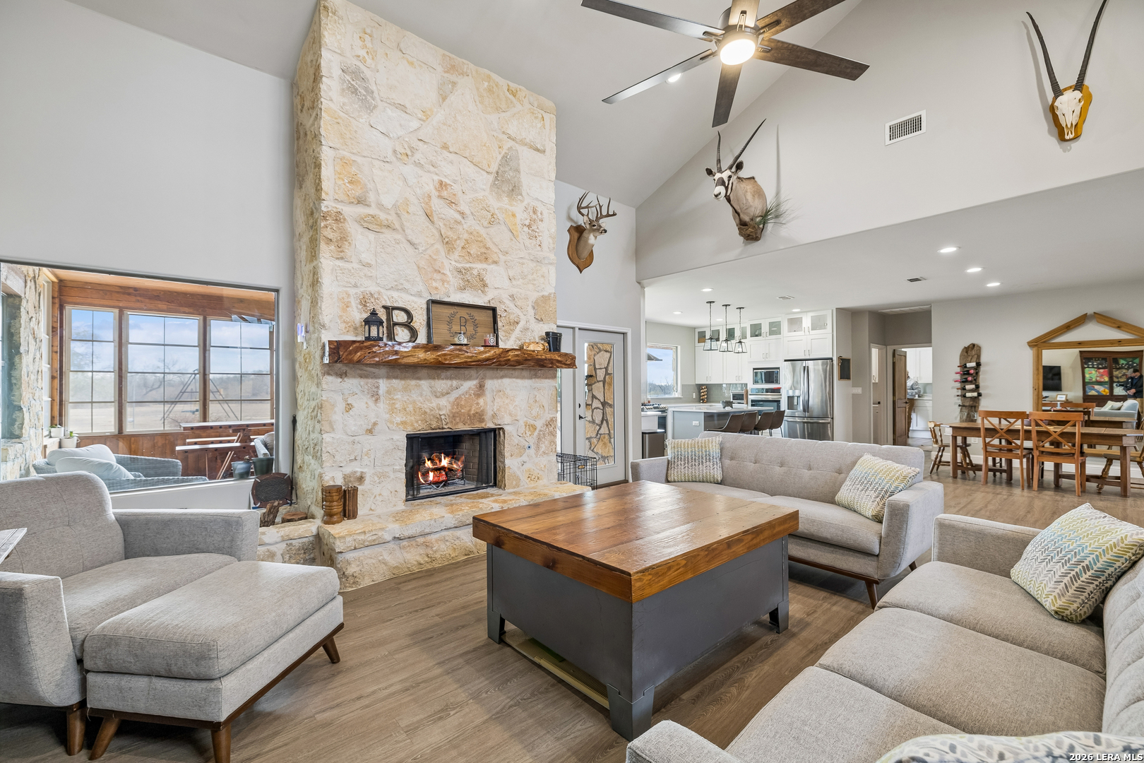 RESIDENCE At the heart of the ranch sits a custom rock home featuring 5 bedrooms and 3.5 baths, thoughtfully designed for both comfort and durability. The home offers generous living spaces ideal for family gatherings and entertaining, including a welcoming living room with a fireplace and a comfortable den located just off the kitchen, creating a natural hub for daily living. The kitchen is supported by a large walk-in pantry and spacious utility room, offering the storage and functionality needed for an active ranch household. A three-car garage provides ample space for vehicles, tools, and equipment. One of the home's most inviting features is the screened-in porch with its own fireplace, creating a comfortable outdoor living space for enjoying cool evenings while overlooking the surrounding ranchland. A fire pit just off the back porch creates the perfect setting for quiet evenings under the stars. IMPROVEMENTS AND OUTBUILDINGS Additional improvements include a well-kept 1,440-square-foot barn with roll-up doors, an unfinished bathroom, and 240-volt electricity, serving as the main equipment and storage hub, complete with a workbench, shelving, and ample space for tractors, trailers, and ATVs. SUMMARY With productive acreage, dependable water, quality improvements, and excellent county road frontage, this property represents a turn-key Texas ranch opportunity-perfect for full-time country living, livestock operations, or a private rural retreat in the heart of Medina County.