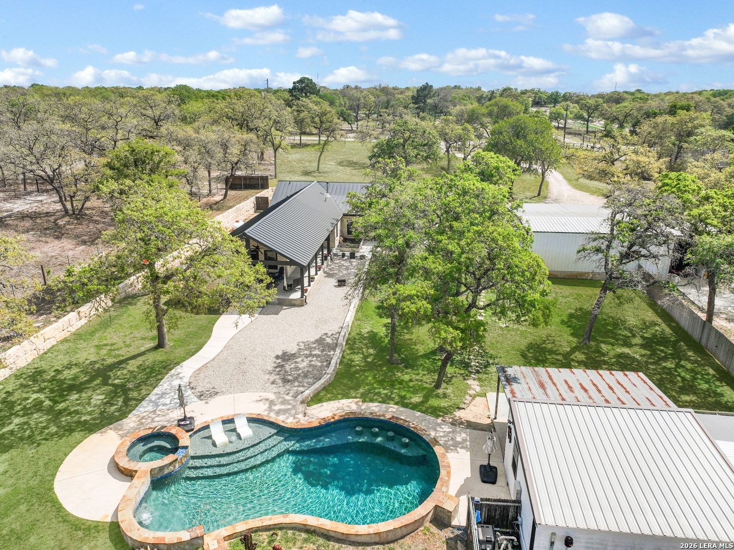 Welcome to your private Texas retreat on approximately 10 acres in Capote Oaks Estates! This beautifully improved property offers 3 bedroom/ 2 full baths and the perfect blend of country living, functionality, and modern updates. The home was fully rebuilt inside in 2024 following a fire, giving buyers peace of mind with updated construction while maintaining its established setting. Step outside and enjoy the stunning in-ground pool and fountains, perfect for relaxing or entertaining, along with a separate pool house/guest quarters that provides flexible space for visitors, extended family, or potential rental income. The property also features a large shop with a dedicated office, ideal for a home business, hobbies, or additional storage, making this a rare find for those needing both residential and workspace options. Situated among mature trees with plenty of room to roam, this property delivers privacy, versatility, and endless possibilities for country living just minutes from town. A truly unique opportunity with major improvements already done-move in and enjoy!