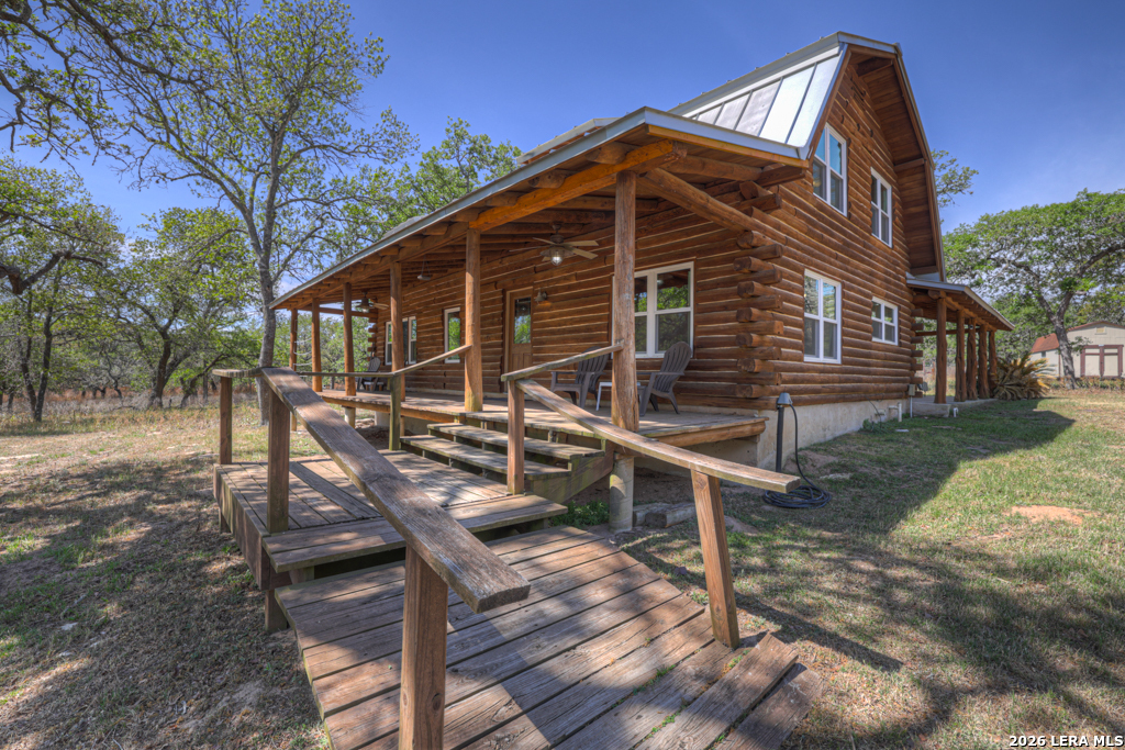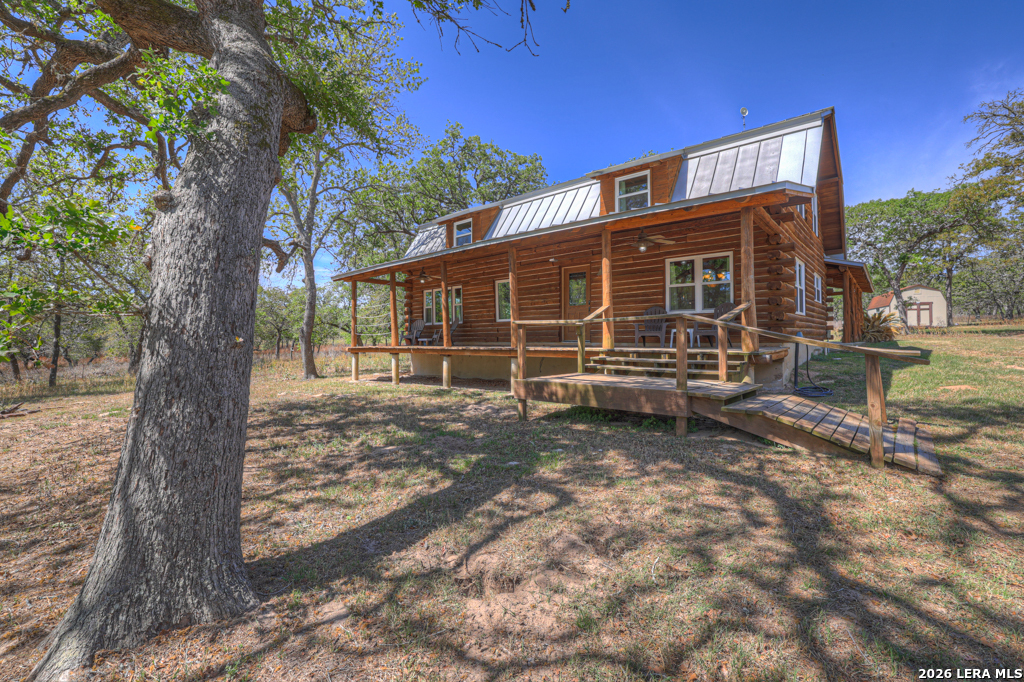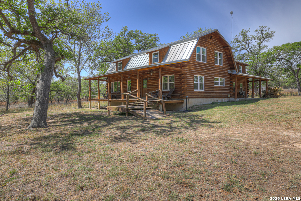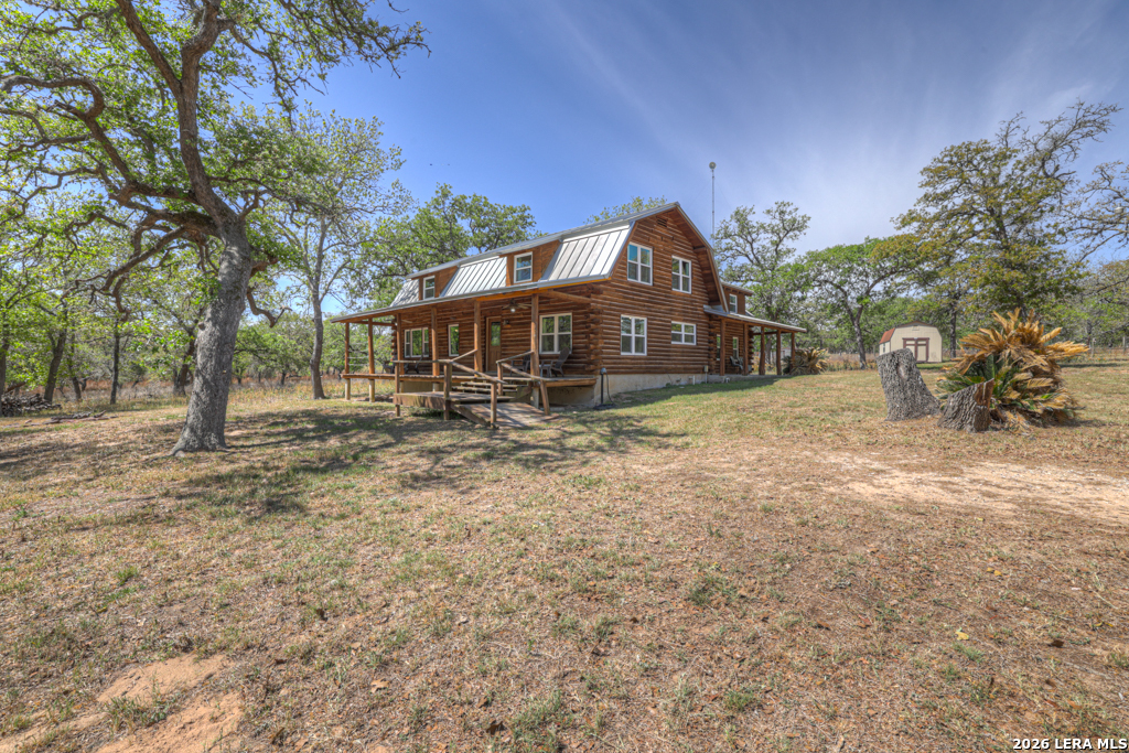 Escape to serenity on this stunning log cabin nestled on 17.699 acres of wooded Hill Country land in Seguin, Texas. This recently updated two-story log cabin features three bedrooms and three bathrooms across 2895 square feet of authentic rustic living. Two separate downstairs living areas offer flexibility for guests, multi-generational living, or income potential. Step onto one of two inviting porches and soak in peaceful countryside views framed by towering mature trees and gently sloping terrain. Inside, the cabin blends log cabin charm with modern comfort. A wood burning heater creates warmth and ambiance while reading, watching the wildlife out the windows, or just disconnecting. The detached two-car garage and outbuildings provide ample storage for equipment and recreational gear. But the real treasure is the land itself. 17.699 acres and a wildlife exemption, making this an exceptional farm and ranch property. Whether you're seeking a peaceful rural retreat, an escape from the city, or just quite living in the Texas Hill Country, this log cabin delivers the secluded country living you've been dreaming of. And while it seems like you are 100 miles from everything, you are just 20 minutes from Seguin, an hour to downtown San Antonio, and 45 minutes from downtown New Braunfels.